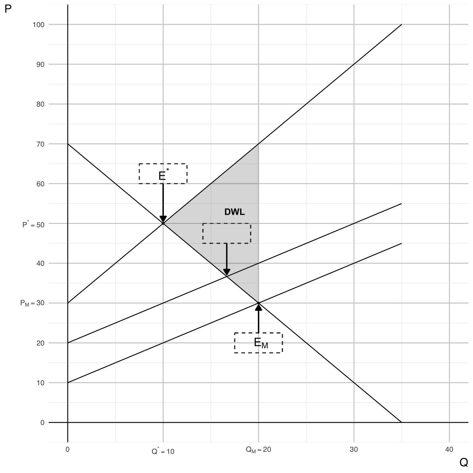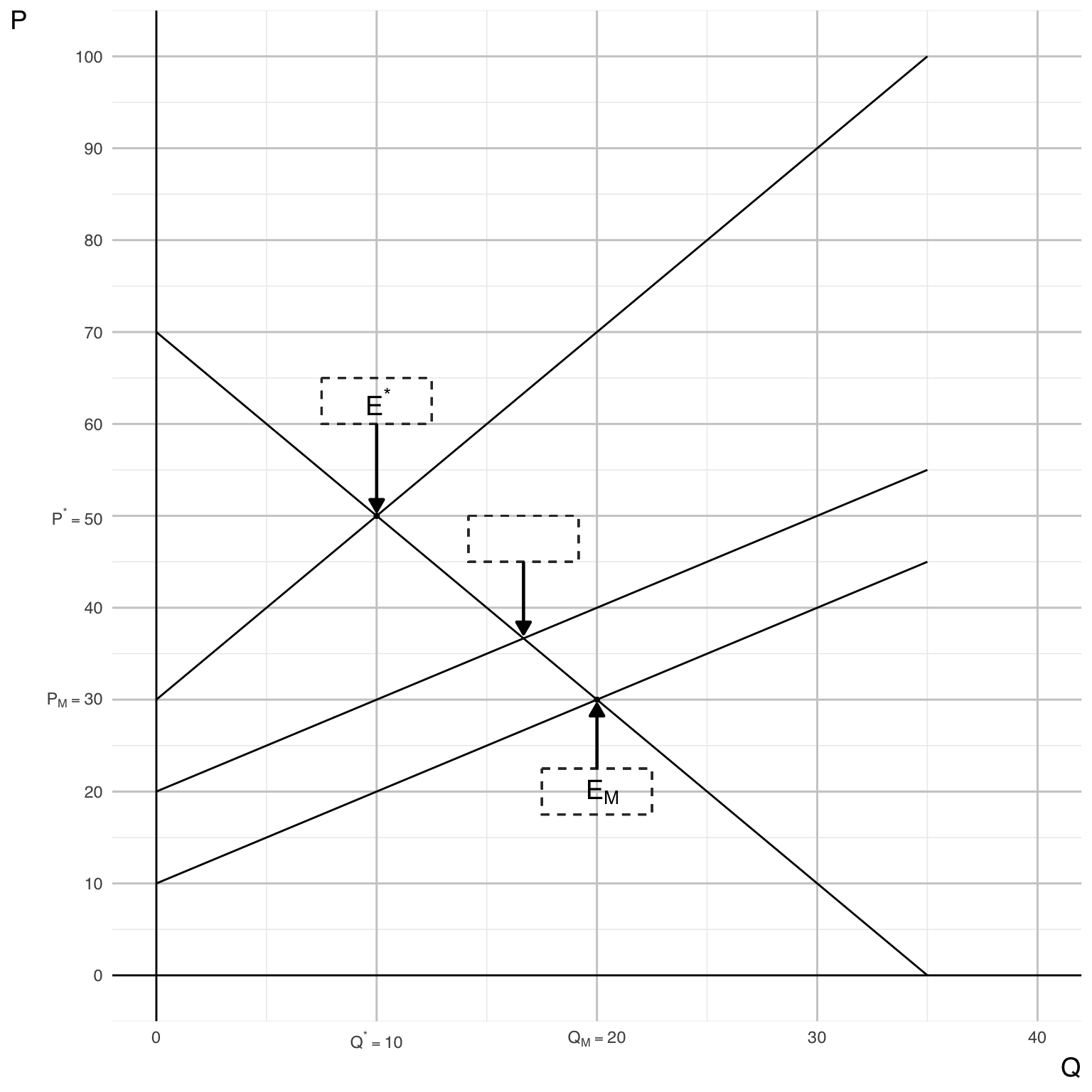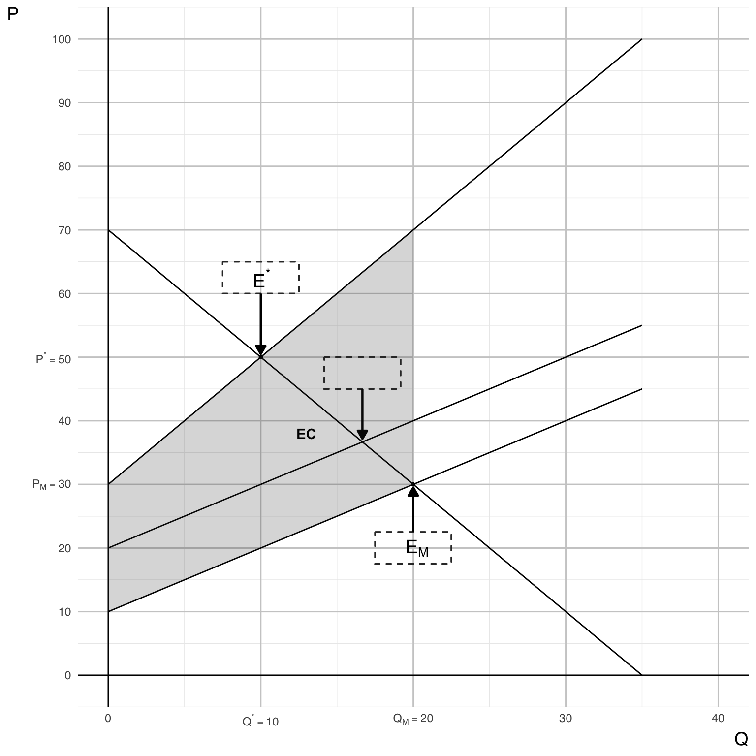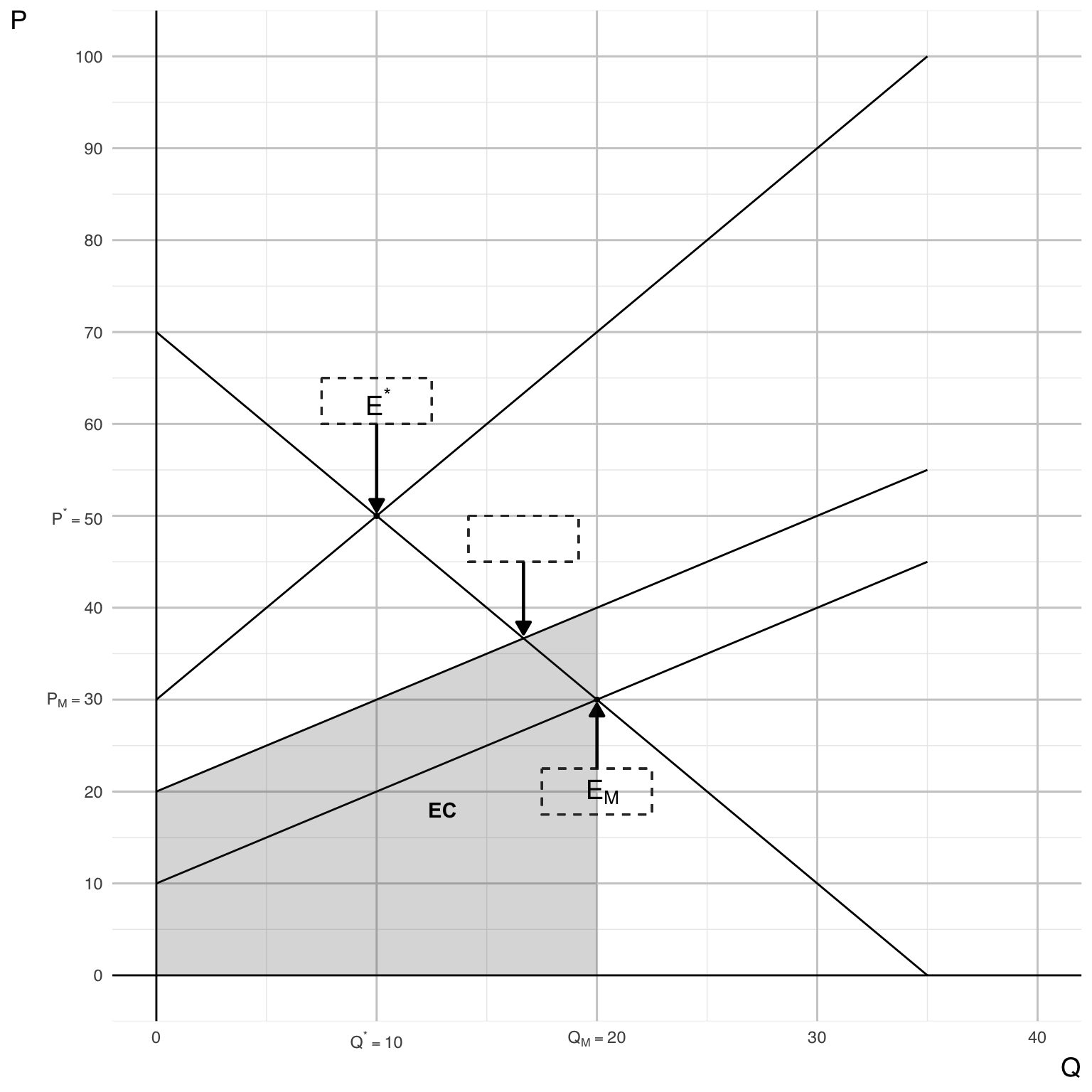 - The market equilibrium point \(E_{M}\) at (\(Q_{M}\), \(P_{M}\)).