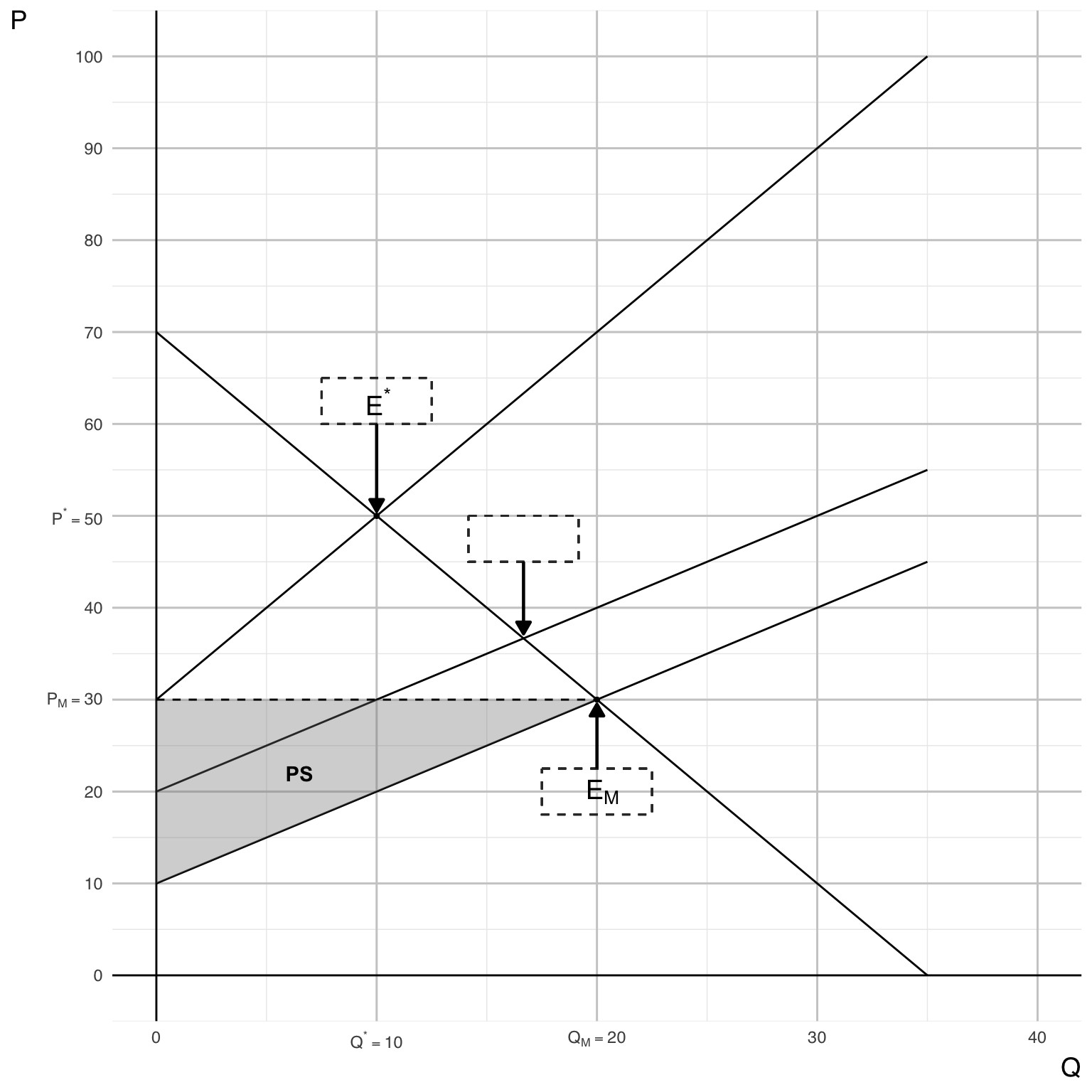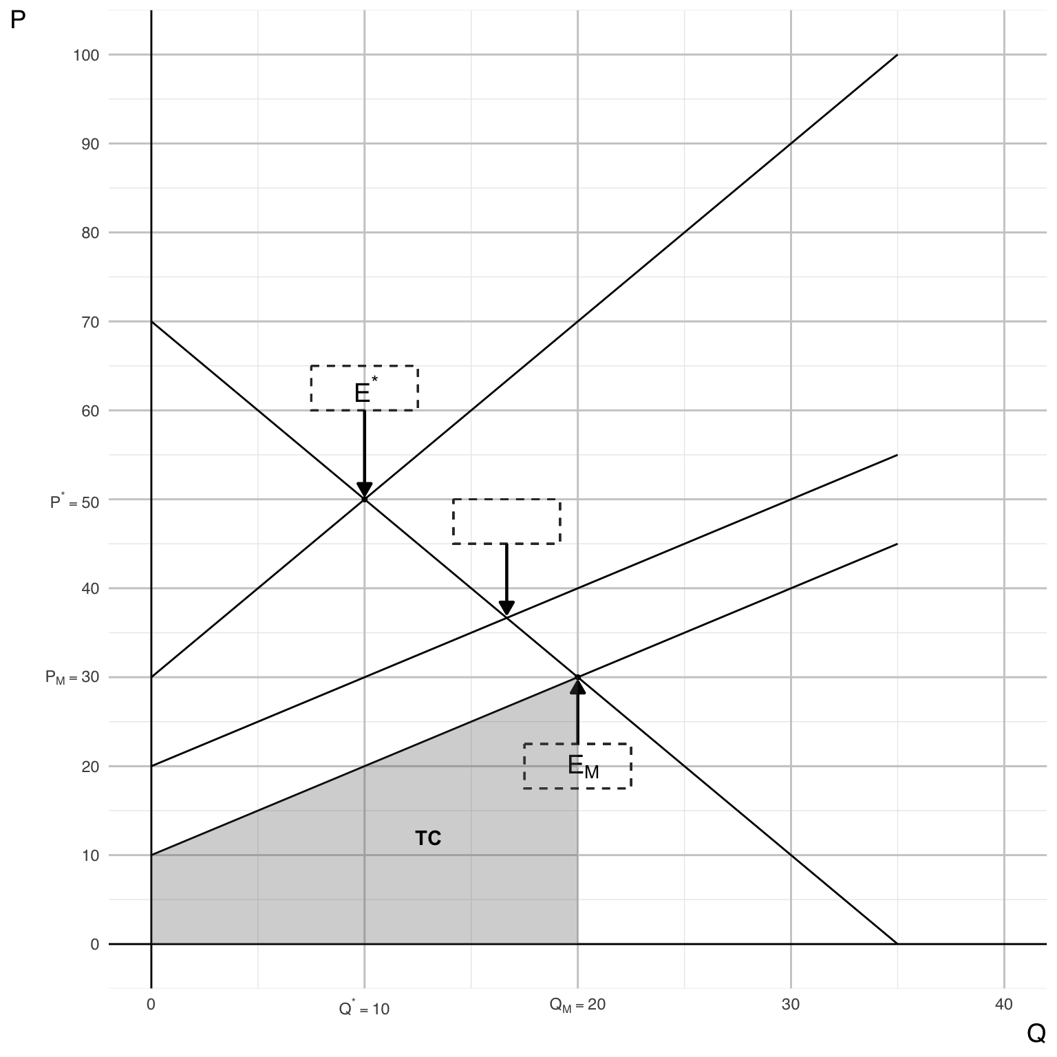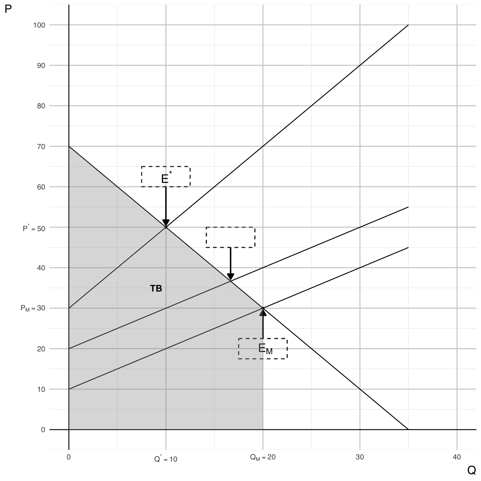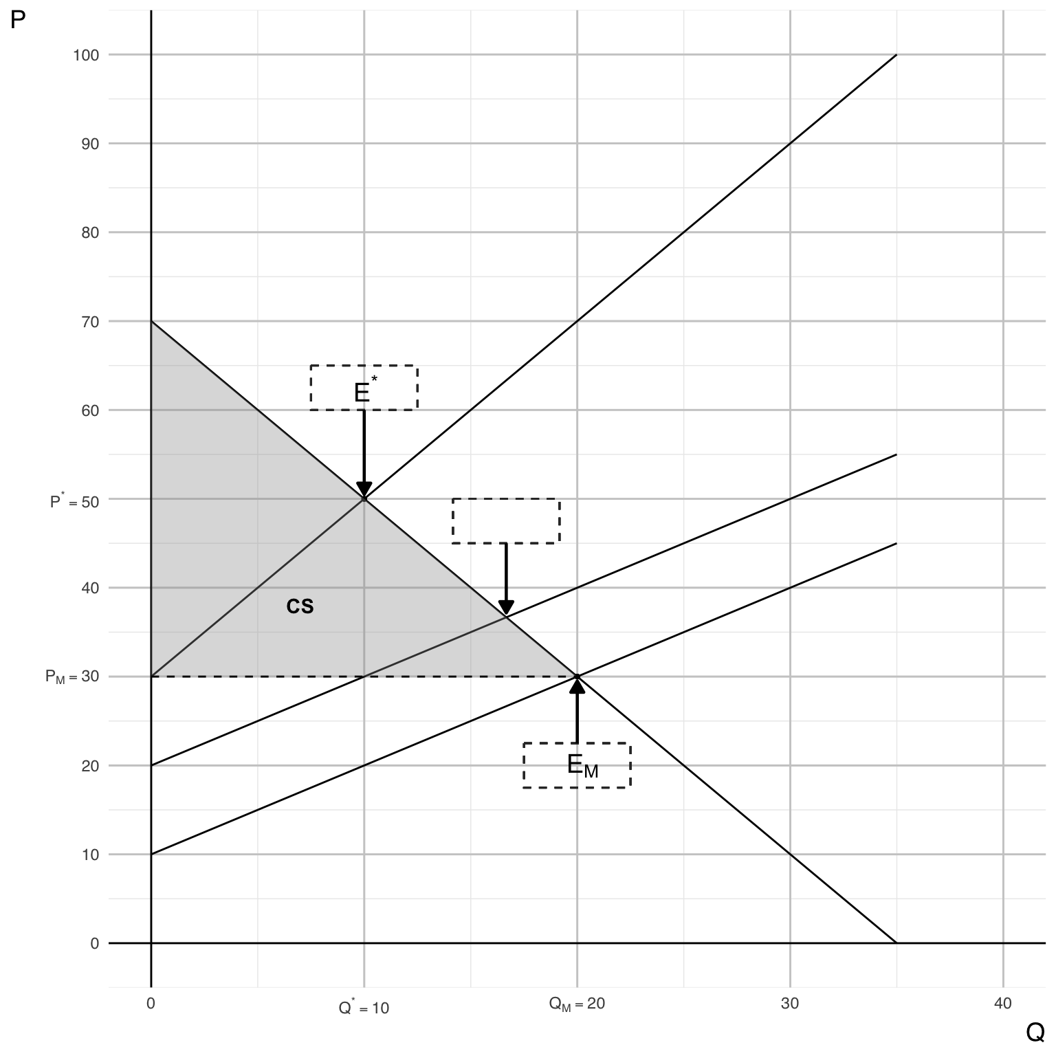 - The market equilibrium point \(E_{M}\) at (\(Q_{M}\), \(P_{M}\)).