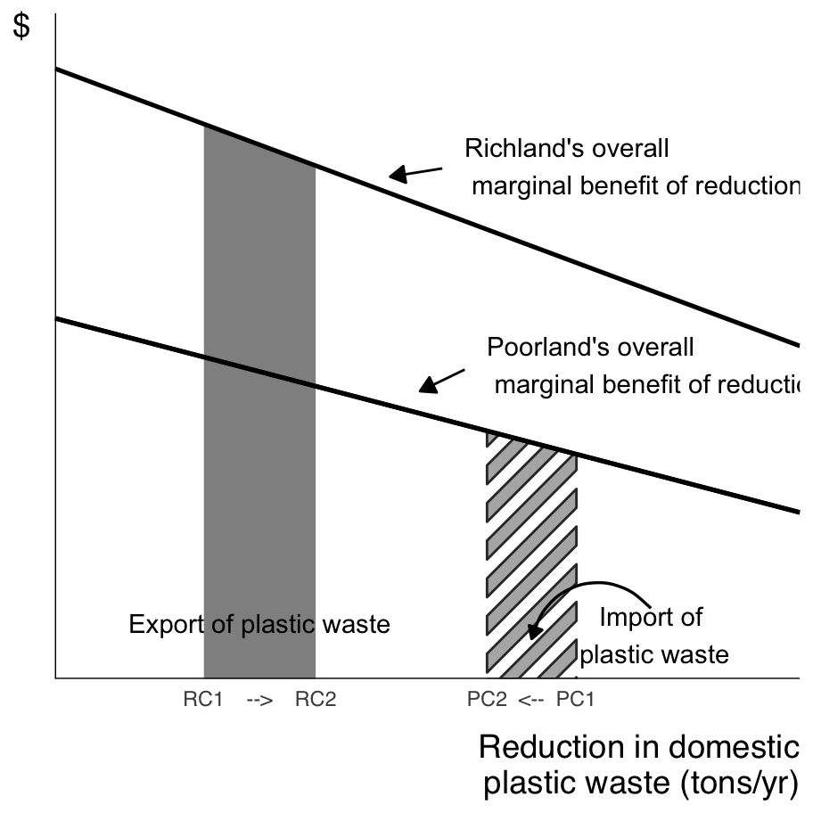 Assume Richland exports its entire volume of plastic waste to Poorland, which has lower income levels and population density, thereby fully eliminating Richland’s domestic external cost of plastic waste.