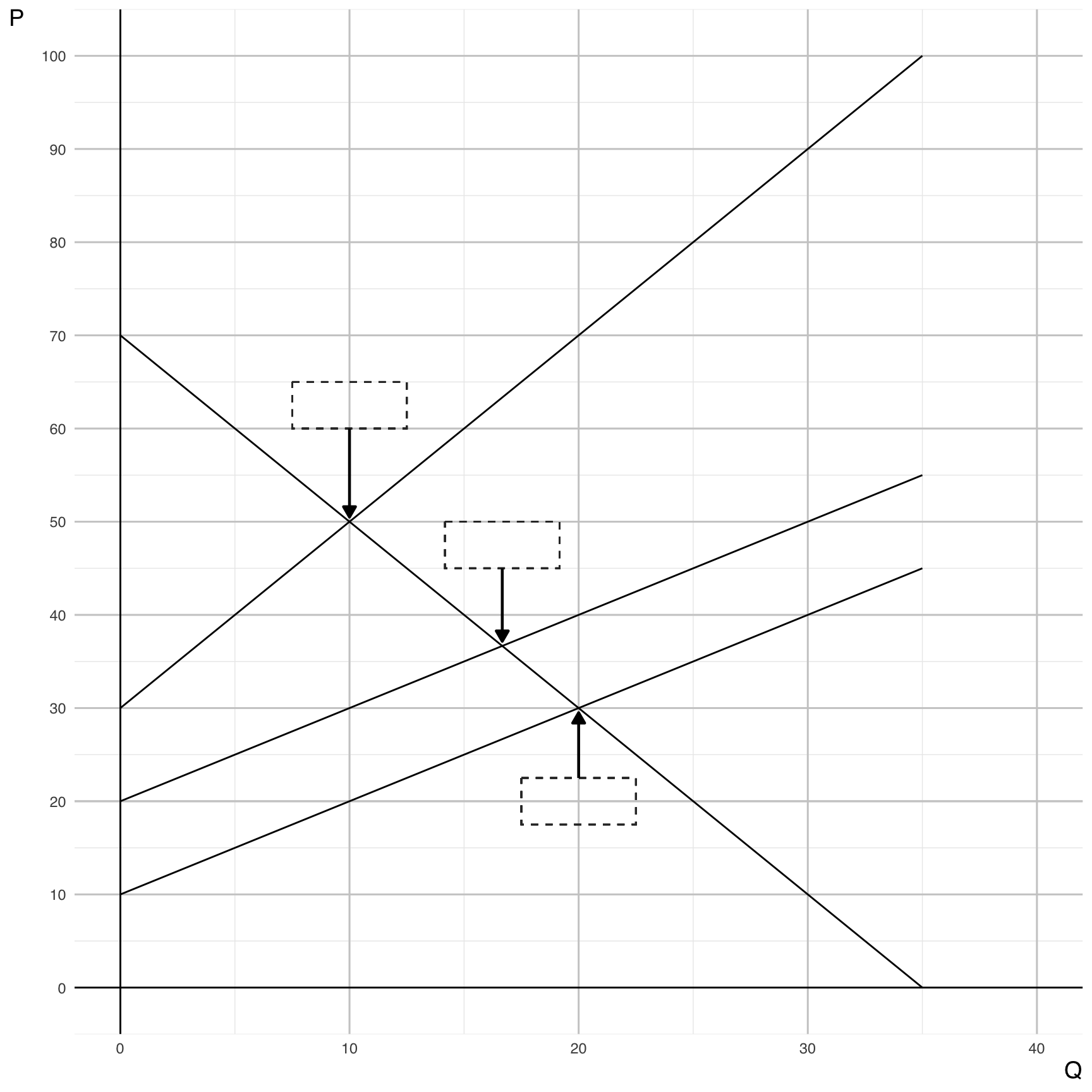 \[ 70 - 2Q = 10 + Q \;\Rightarrow\; Q^{*}_{\text{NEW}} = 20,\quad P^{*}_{\text{NEW}} = 30. \]