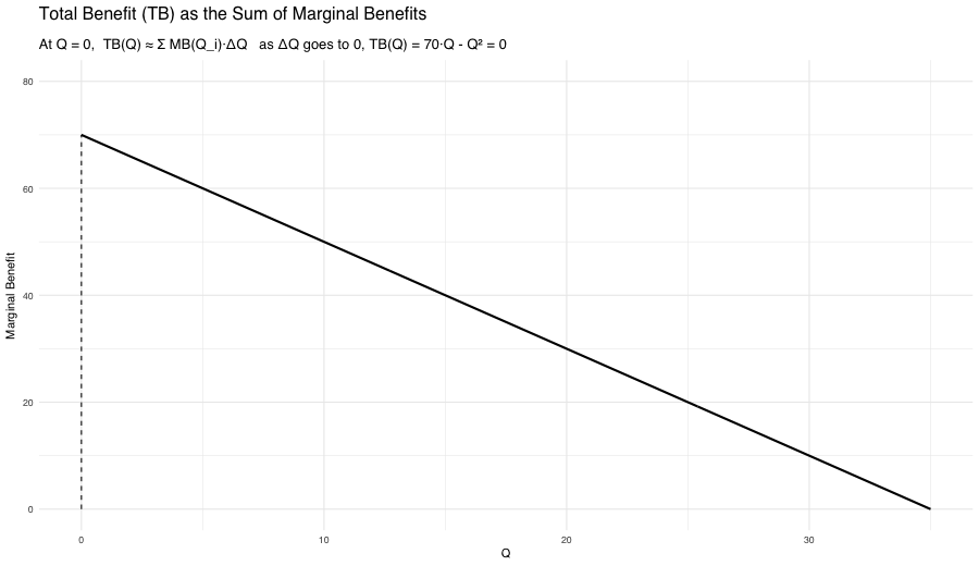As the bars get thinner: \[ TB(Q) \approx \sum_{i=1}^{n} MB(Q_i) \cdot \Delta Q_i \quad \text{(many thin bars stacked side by side)}, \]