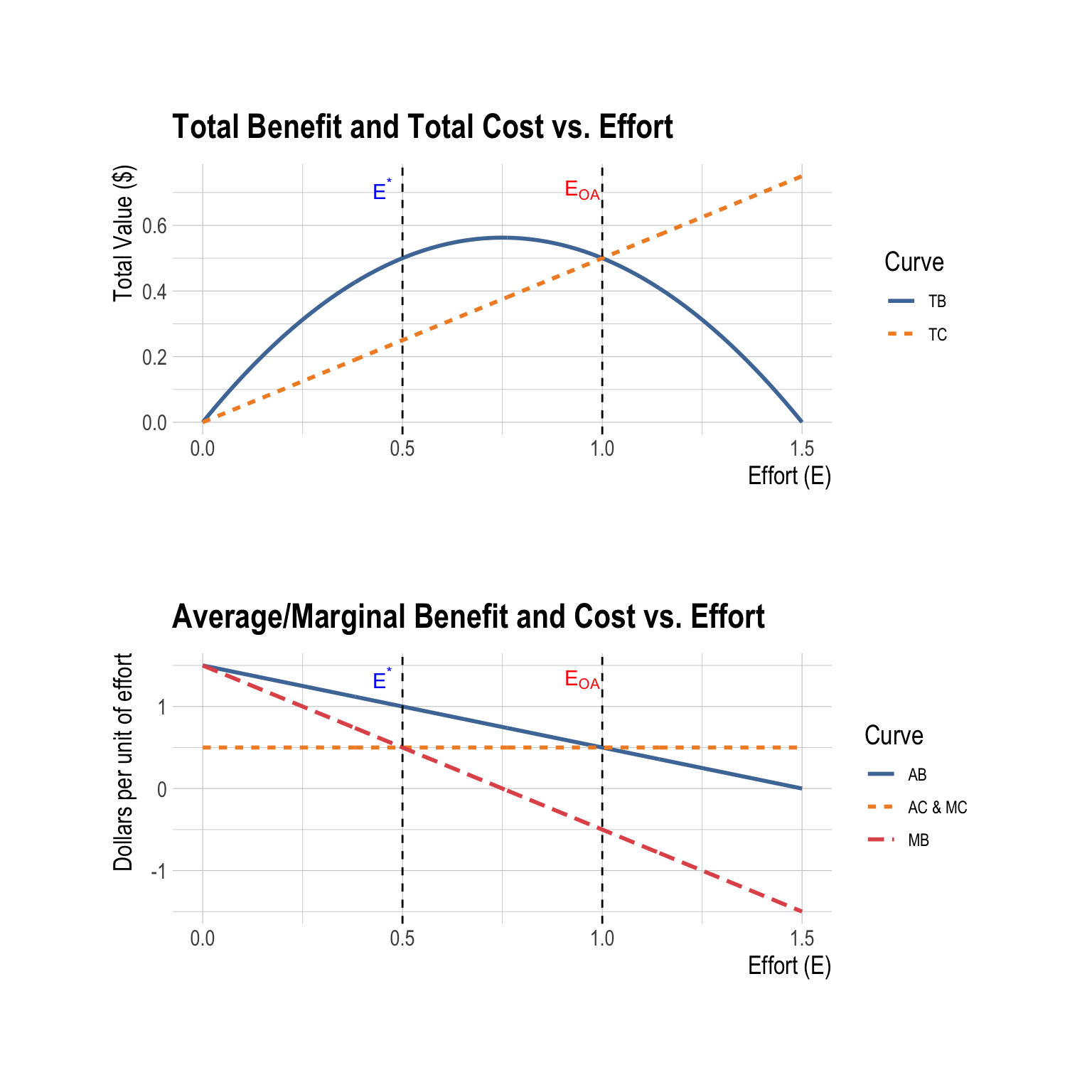 - At \(E_{OA}\), total effort exceeds the efficient level \(E^*\) because individual fishers ignore how their effort affects others and the fish stock.