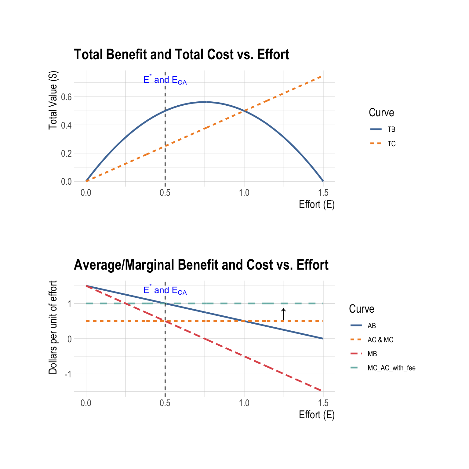 - Analytically: A per-unit license fee raises each fisher’s private cost of fishing effort. This shifts the AC/MC curve upward, so that the new open-access equilibrium occurs at a lower effort level. The fee can be set so that the new equilibrium aligns exactly with the efficient level \(E^*\).