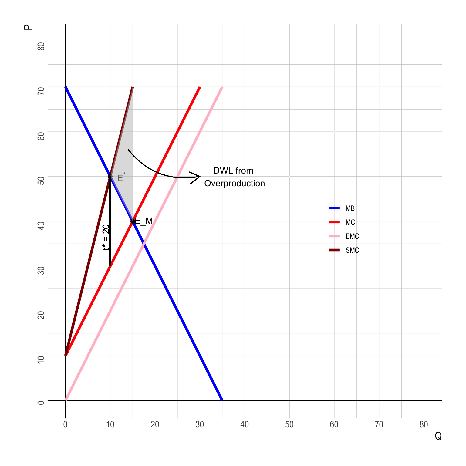 Pigouvian tax: set \(t^{*} = EMC(Q^{*})\):