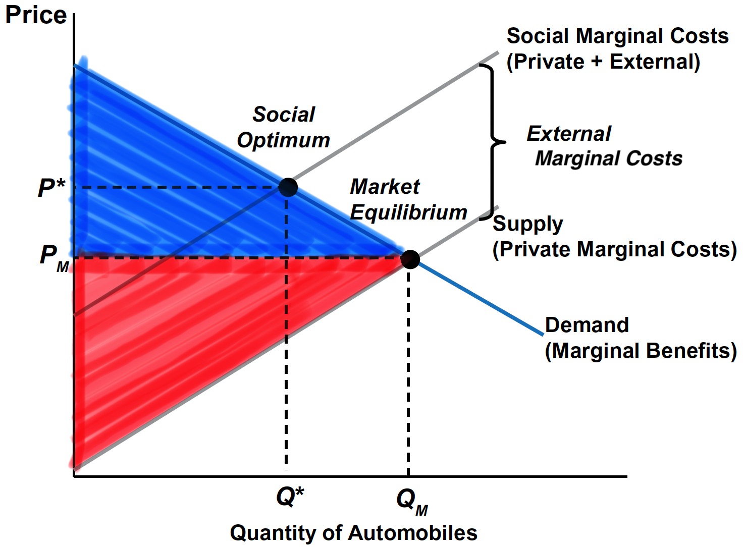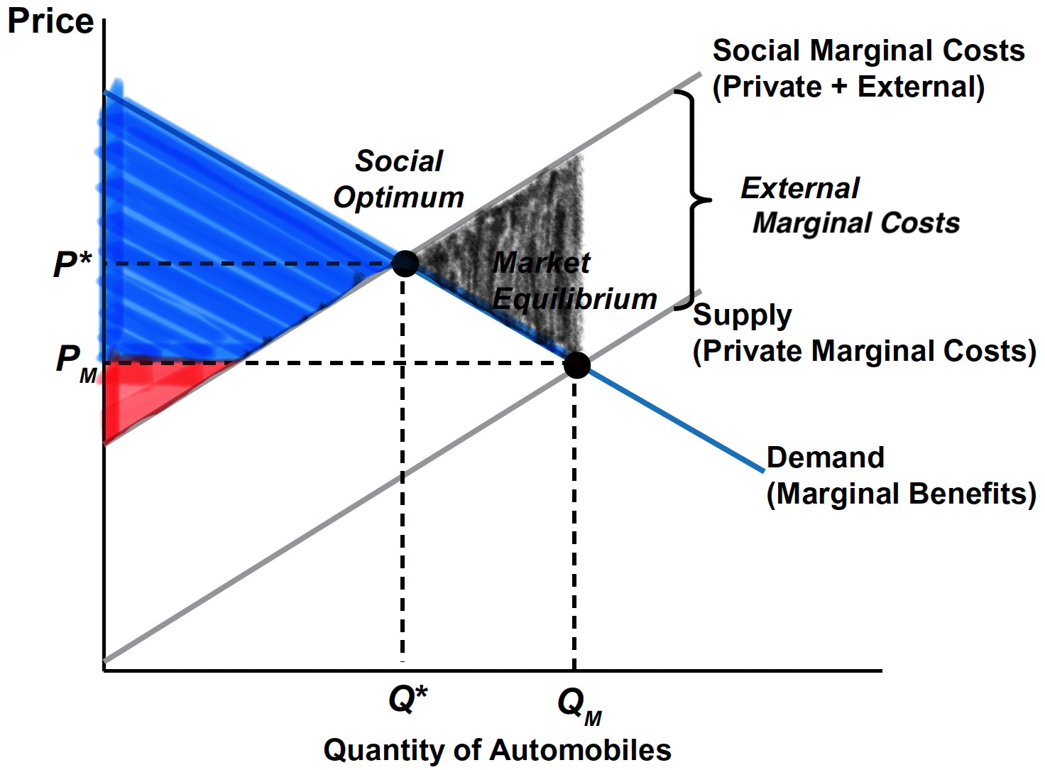With such a negative externality, true social welfare (SW) is: \[ \begin{align} &\quad\;\; (\text{SW})\,=\, (\text{CS} + \text{PS}) \,-\, (\text{External Cost}). \end{align} \]