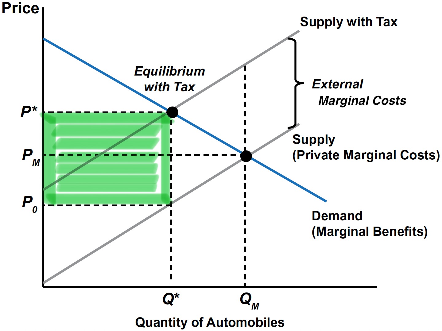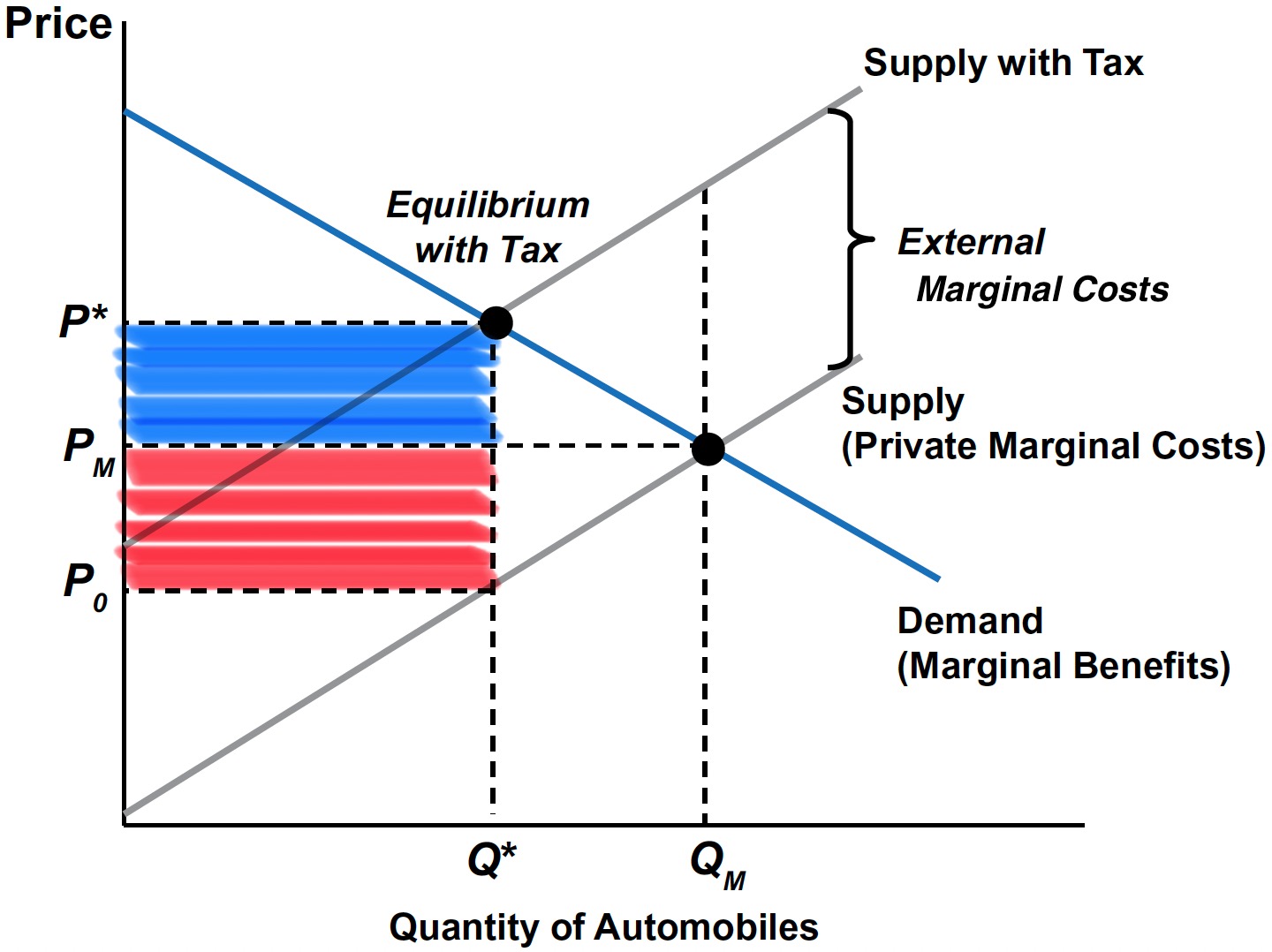 With such a negative externality, true social welfare (SW) is: \[ \begin{align} &\quad\;\; (\text{SW})\,=\, (\text{CS} + \text{PS} + \text{Tax Revenue}) \,-\, (\text{External Cost}). \end{align} \]