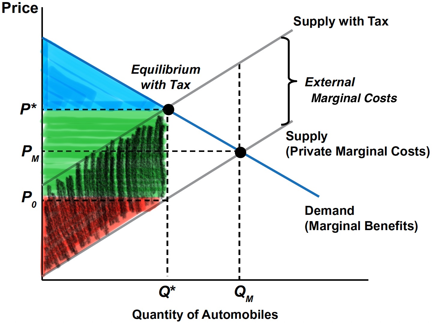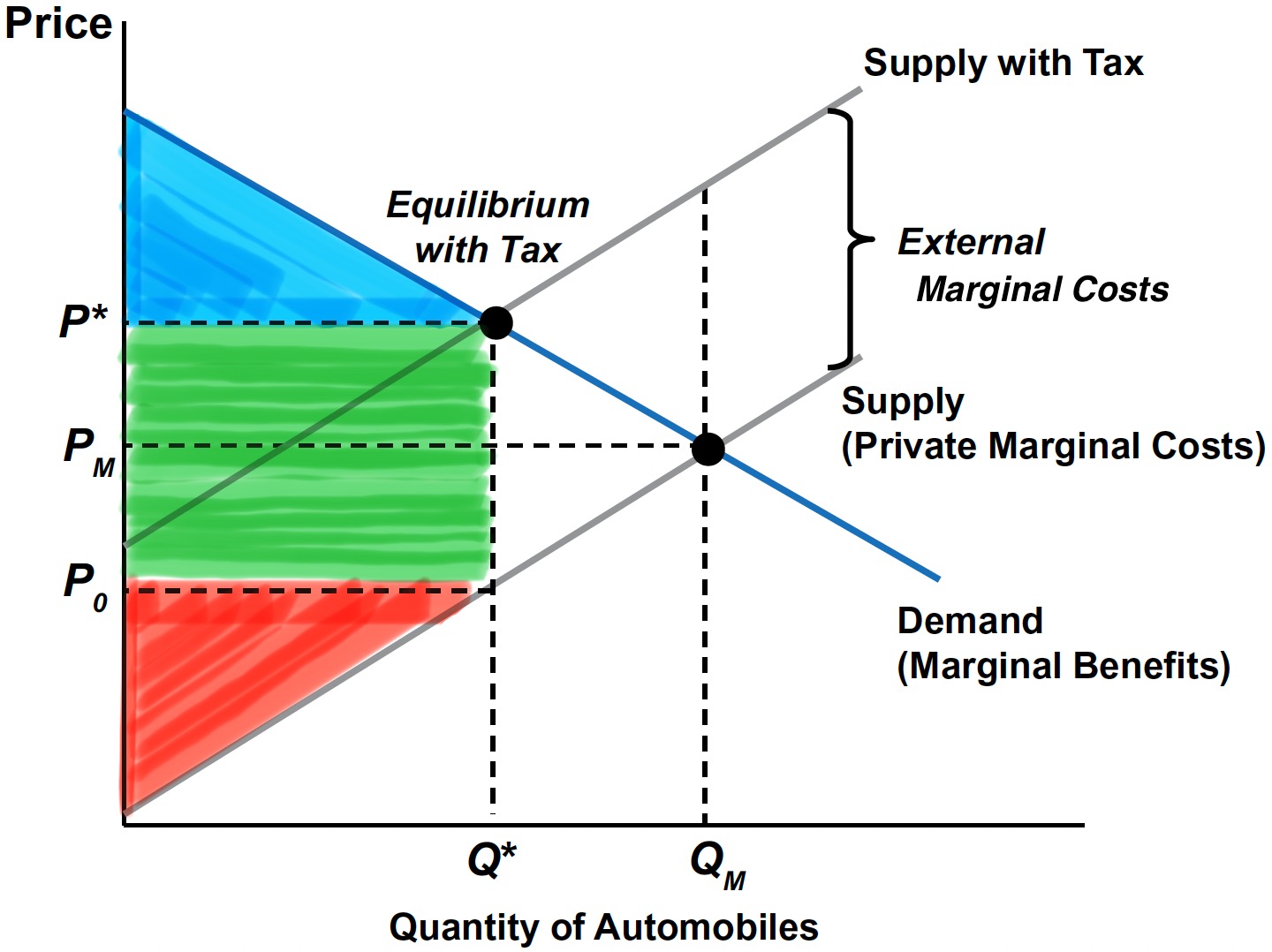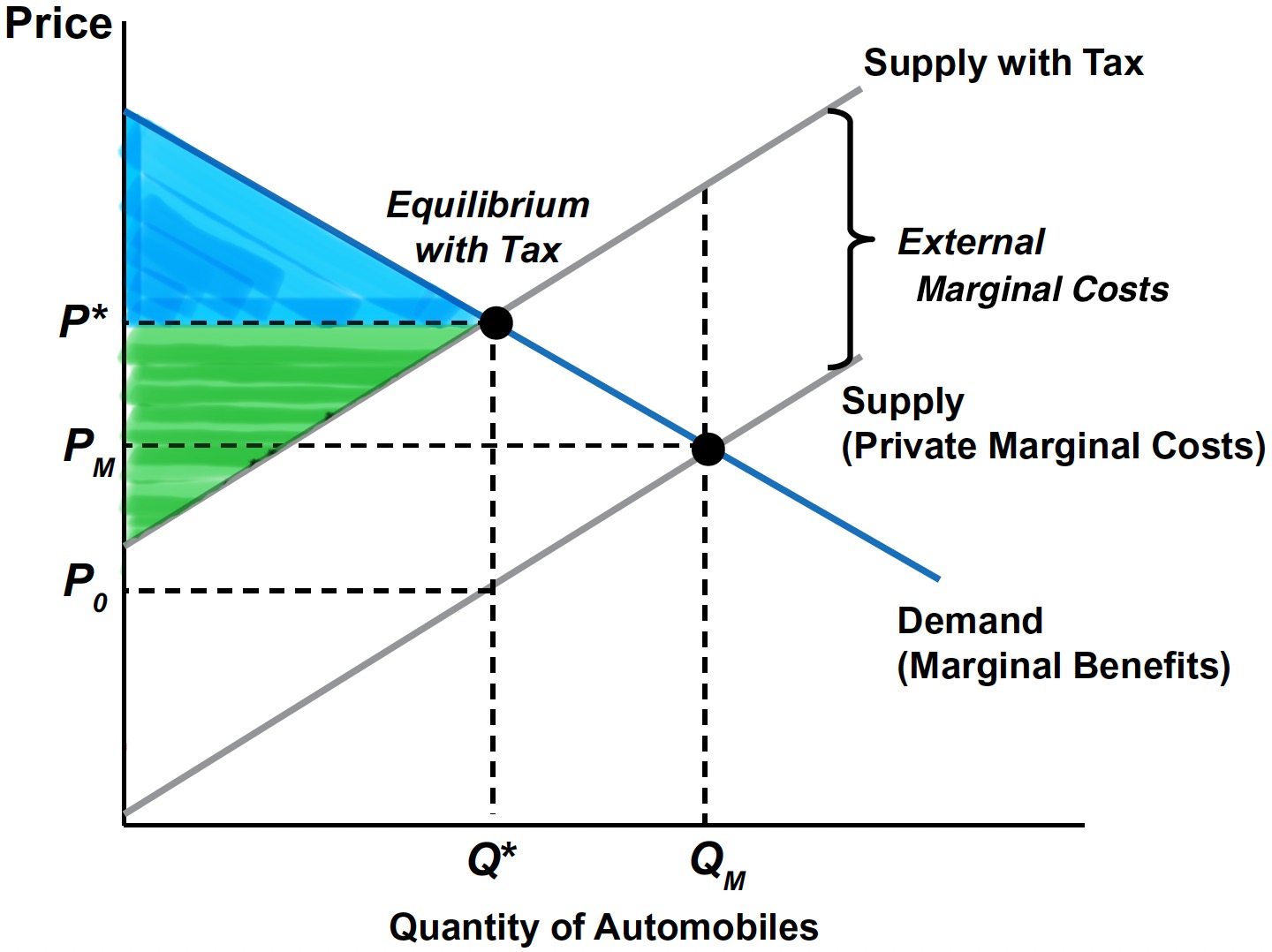 With Pigouvian tax, CS and PS are measured over quantities from 0 to \(Q^{*}\), the new equilibrium quantity.