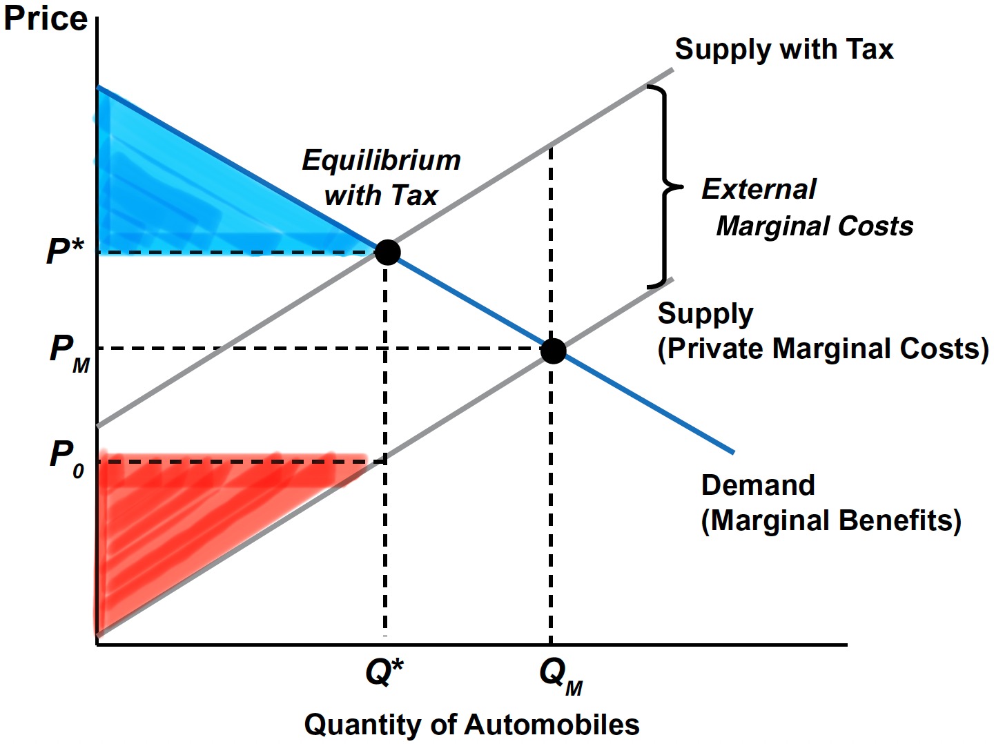 Pigouvian tax caps external damage by shifting the market to the efficient quantity \(Q^{*}\).