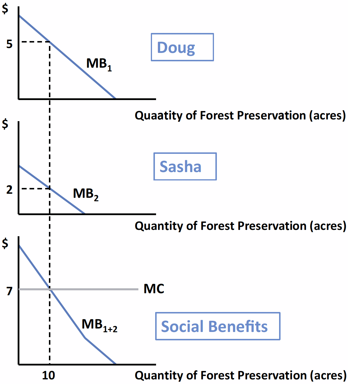 To obtain society’s marginal benefit at quantity \(Q\), add their MBs vertically (because both consume the same public good). If at \(Q=10\) acres Doug’s MB is $5 and Sasha’s is $2, then the social MB at 10 acres is $7.